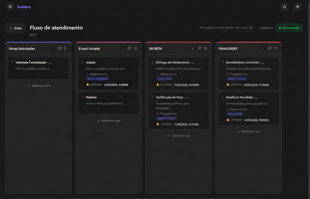 Inspirado em metodologias Kanban, o fluxo organiza demandas em etapas visuais e dinâmicas, permitindo que equipes acompanhem o progresso de cada atendimento, evento ou negociação em tempo real.