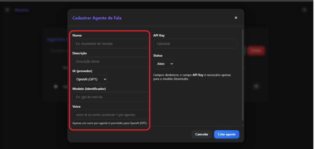 Informe os dados cadastrais do agente de Fala.