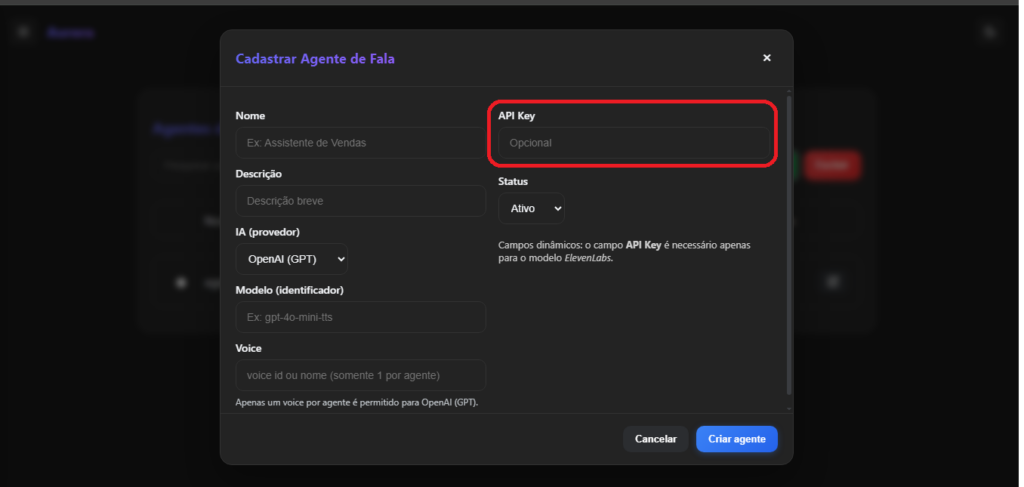 Para evitar sobrecarga da chave API, você pode definir uma chave exclusiva apenas para o agente de fala.