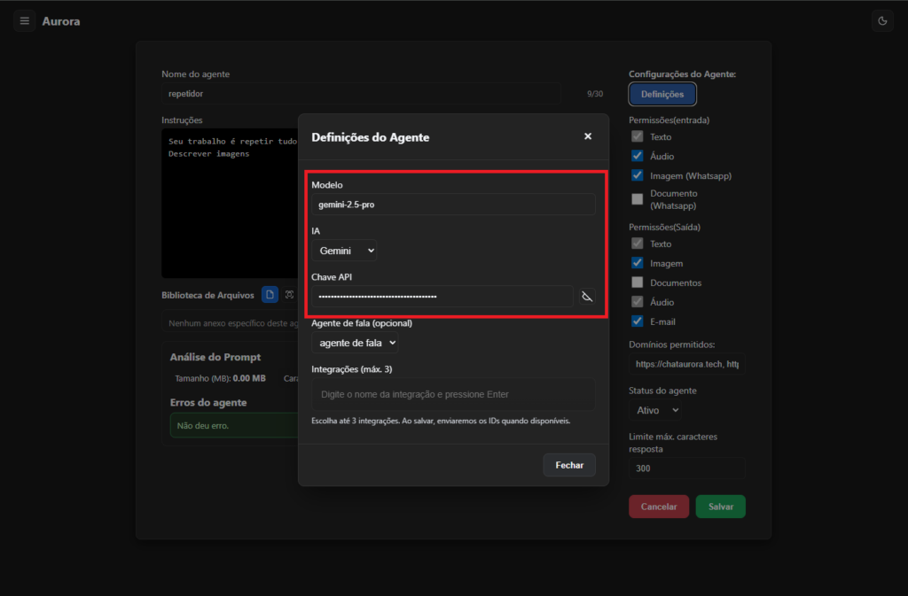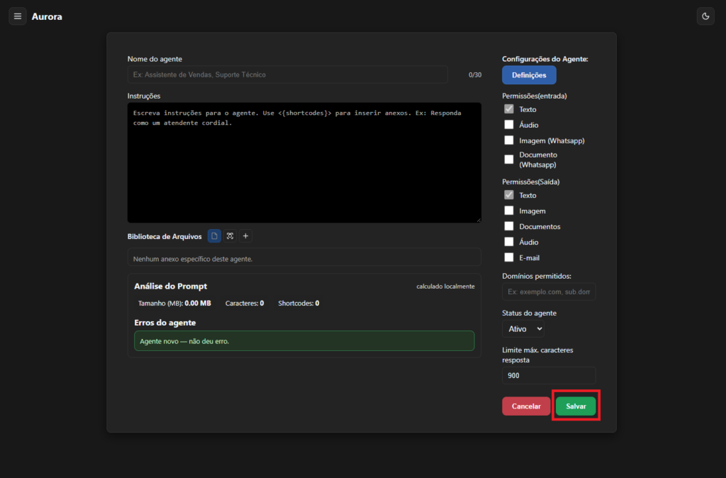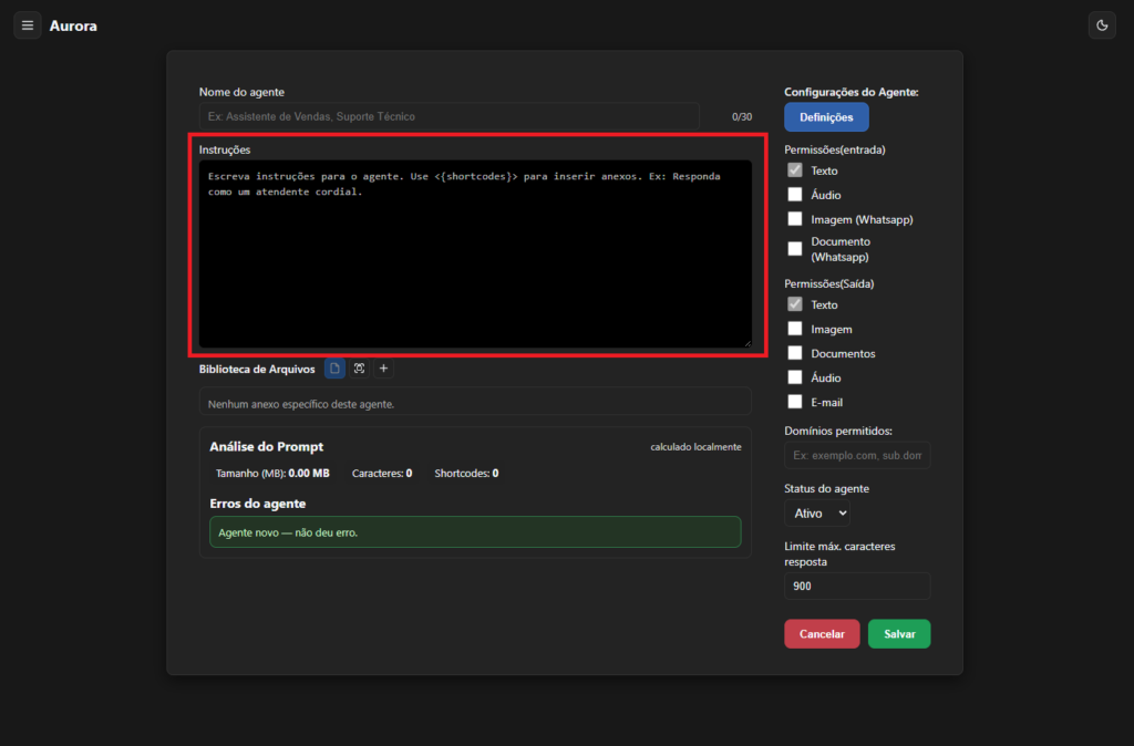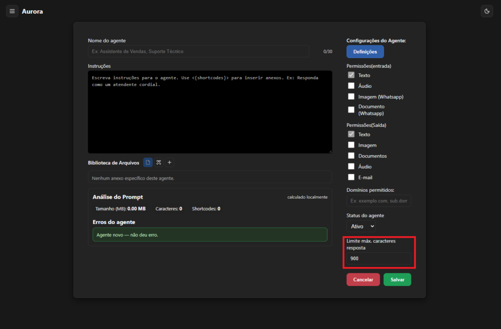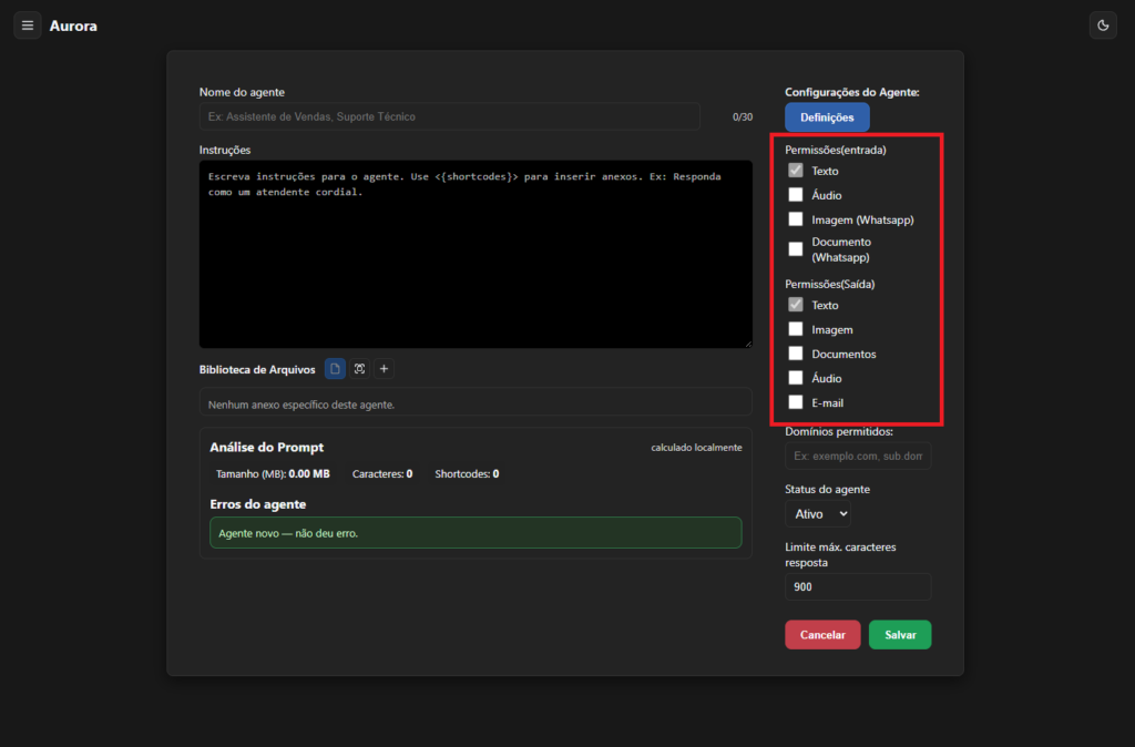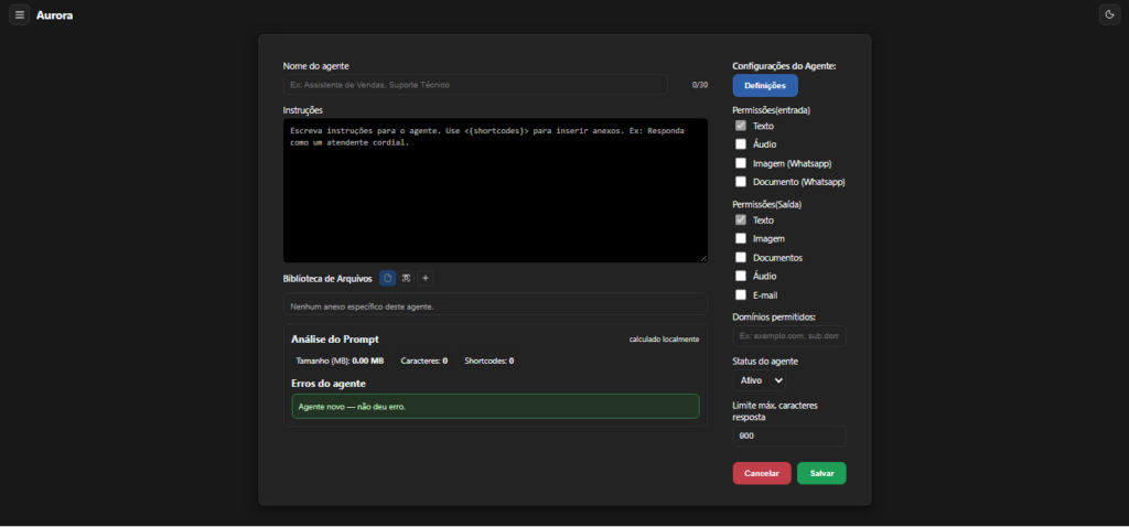 saida_filtrada? → Permissões de saída bloquearam algo.O Aurora permite que qualquer empresa crie agentes de atendimento automatizado utilizando IA.